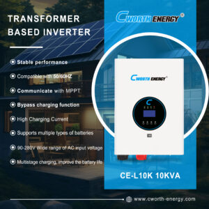 CE-L10K is a heavy-duty, low-frequency (transformer-based) inverter designed for industrial-strength reliability. Unlike high-frequency models, this “transformer-based” powerhouse is engineered to handle massive inductive loads—such as large motors, air conditioners, and deep freezers—without the stress that typically causes electronic failures in smaller units.. Requires external MPPT charge controller 80A/120A