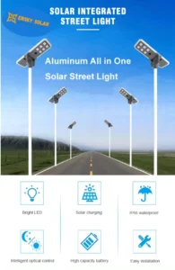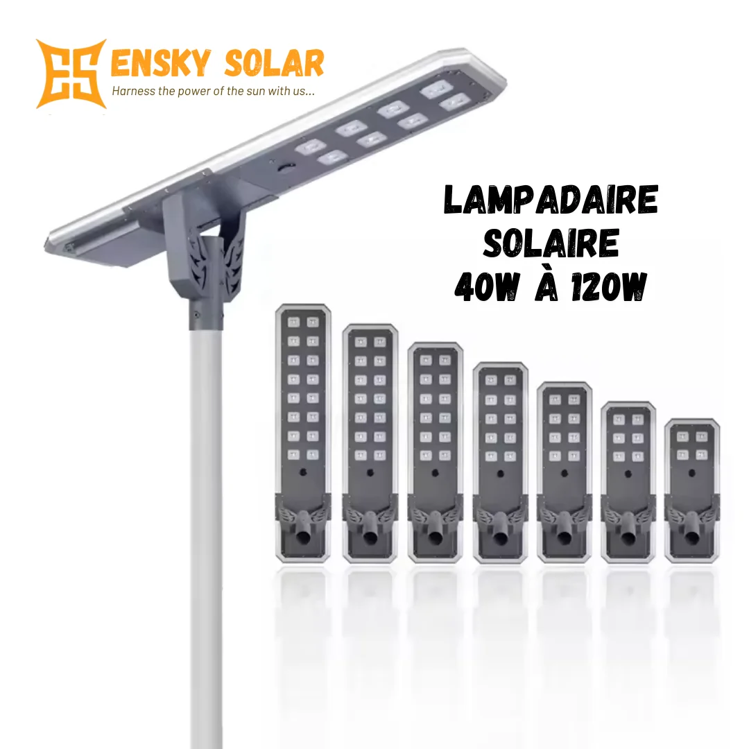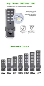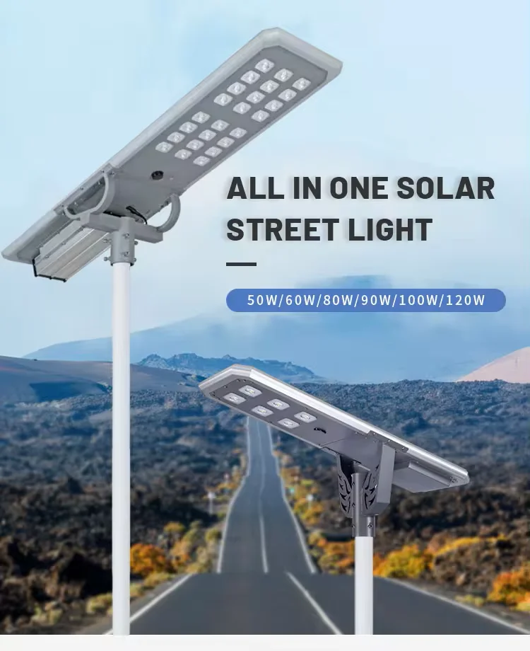 Discover our robust and efficient all-in-one solar street light, available in wattages ranging from 40W to 150W. Equipped with a high-quality lithium battery, this solar street light comes with a 3- to 5-year warranty, ensuring long-term reliability. With a 48-hour battery life and an impressive lifespan of 50,000 hours, this solar street light is designed to withstand the most demanding conditions while providing powerful and consistent illumination. Enjoy renewable energy without compromising on performance with our all-in-one solar street light, a sustainable and economical solution for outdoor lighting