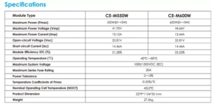 Multi-Busbar (MBB) Design: The CE-M550W uses multiple busbars to shorten the distance current travels across the cell. This reduces “micro-crack” risks and increases the overall reliability and output of the module over its 25-year lifespan.