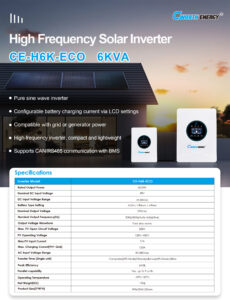CE-H6K-ECO is a high-performance 6000W hybrid inverter designed for hybrid, off-grid and backup power solutions. This ECO model focuses on reliability and affordability. It is a “true” hybrid, meaning it can manage power simultaneously from solar panels, batteries, and the grid (ENEO) or a generator.
