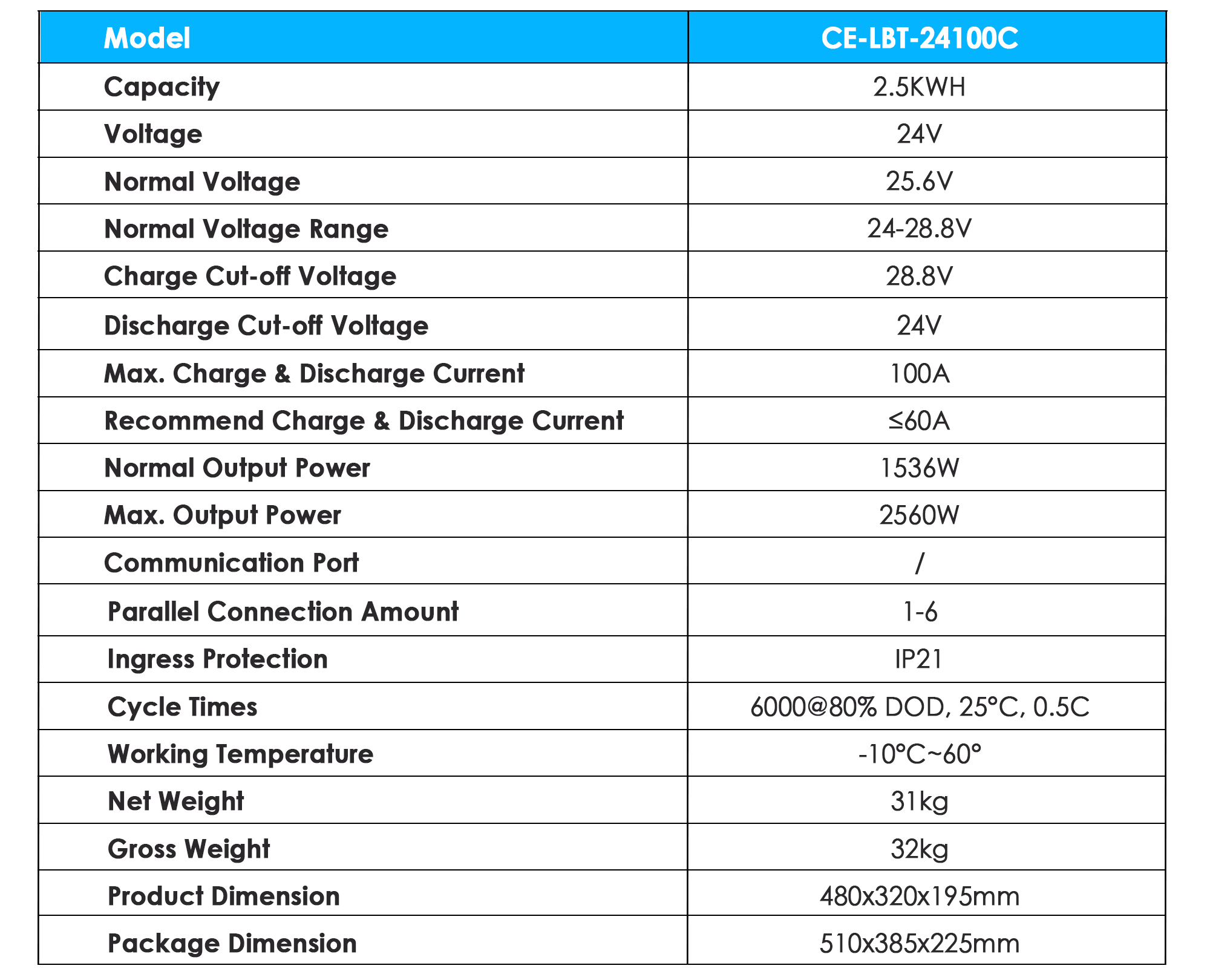 CE-LBT-24100C is a high-performance 24V lithium iron phosphate (LiFePO4) battery pack designed for residential and light commercial solar systems. Often referred to as a “Half-Rack” module, it provides 2.5kWh of energy storage. long-lasting alternative to heavy Gel battery banks. 98% Depth of Discharge (DoD)
